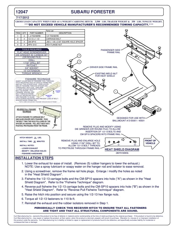 Whatever the next checkpoint is on your adventure -- whether it's getting your bike on the trail before sunrise or making it to the campground before dark -- CURT class 2 hitches let you Bring It with confidence. These receiver hitches are made to handle most light-duty towing applications and offer a custom fit for your vehicle. Typically used on full-size cars, crossovers, compact SUVs, minivans or even compact pickup trucks, a CURT class 2 trailer hitch complements the design of smaller vehicles. This particular class 2 hitch is made to be a custom hitch for certain years of the Subaru Forester (to verify vehicle compatibility, see application info). It offers a weight carrying capacity of 3,500 lbs. GTW and 350 lbs. TW. Class 2 trailer hitches can typically be used to tow a variety of lightweight trailers, such as a small utility trailer, small fishing boat trailer or popup camper (NOTE: Never exceed the lowest weight capacity of any towing component). They are also perfect for adding cargo space to your vehicle with a bike rack or cargo carrier. This class 2 hitch features a 1-1/4" receiver tube to accept a ball mount shank or other hitch-mounted accessory. For safety, it is tested in accordance with SAE J684. A custom trailer hitch design requires extra care, and as such, CURT class 2 hitches are engineered using real vehicles and hands-on research. We use high-strength steel, robotic welding and rigorous testing to produce hitches that are built to fit your lifestyle. To ensure that each hitch will be a reliable extension of your vehicle, we also finish our hitches in a co-curing of liquid A-coat and black powder coat, giving them long-lasting rust and wear resistance.