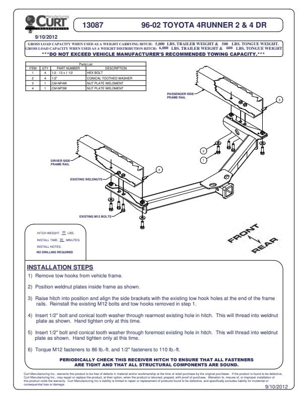 Whatever your task at hand -- whether it's launching that boat before daybreak, setting up your camper before the rush or getting a final load to the dump before close -- CURT class 3 trailer hitches offer the strength needed for serious towing. They make it easy to hitch up and Bring It, offering a vehicle-specific fit and the weight capacity to handle a variety of trailers. Custom class 3 hitches are the most common type of receiver hitch for pickup trucks and SUVs. Because of their weight range, they are also found on full-size cars, crossovers and minivans. Each custom-fit class 3 hitch package is made for vehicle-specific mounting. This particular kit fits certain years of the Toyota 4Runner (see application info to verify vehicle compatibility). It provides a weight carrying capacity of 5,000 lbs. GTW and 500 lbs. TW. It is also compatible with a weight distribution hitch for level towing and a rating of 6,000 lbs. WD and 600 lbs. WDTW. CURT class 3 trailer hitches are typically used to attach and haul utility trailers, boat trailers, campers, snowmobile or ATV haulers and more (NOTE: Never exceed the lowest-rated towing component). Each class 3 hitch has a 2 receiver tube and is tested in accordance with SAE J684 for safety. To ensure that CURT class 3 receiver hitches have what it takes for serious trailering, they are designed using a hands-on approach and are constructed with rugged, high-strength steel and precise welding. We also protect our class 3 hitches in a co-cured finish of liquid A-coat and black powder coat for superior resistance to rust, chipping and UV damage.