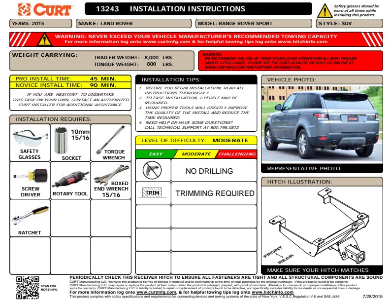 Whatever your task at hand -- whether it's launching that boat before daybreak, setting up your camper before the rush or getting a final load to the dump before close -- CURT class 3 trailer hitches offer the strength needed for serious towing. They make it easy to hitch up and Bring It, offering a vehicle-specific fit and the weight capacity to handle a variety of trailers. Custom class 3 hitches are the most common type of receiver hitch for pickup trucks and SUVs. Because of their weight range, they are also found on full-size cars, crossovers and minivans. Each custom-fit class 3 hitch package is made for vehicle-specific mounting. This particular kit fits certain years of the Land Rover Range Rover Sport (see application info to verify vehicle compatibility). It provides a weight carrying capacity of 8,000 lbs. GTW and 800 lbs. TW. CURT class 3 trailer hitches are typically used to attach and haul utility trailers, boat trailers, campers, snowmobile or ATV haulers and more (NOTE: Never exceed the lowest-rated towing component). Each class 3 hitch has a 2" receiver tube and is tested in accordance with SAE J684 for safety. To ensure that CURT class 3 receiver hitches have what it takes for serious trailering, they are designed using a hands-on approach and are constructed with rugged, high-strength steel and precise welding. We also protect our class 3 hitches in a co-cured finish of liquid A-coat and black powder coat for superior resistance to rust, chipping and UV damage.