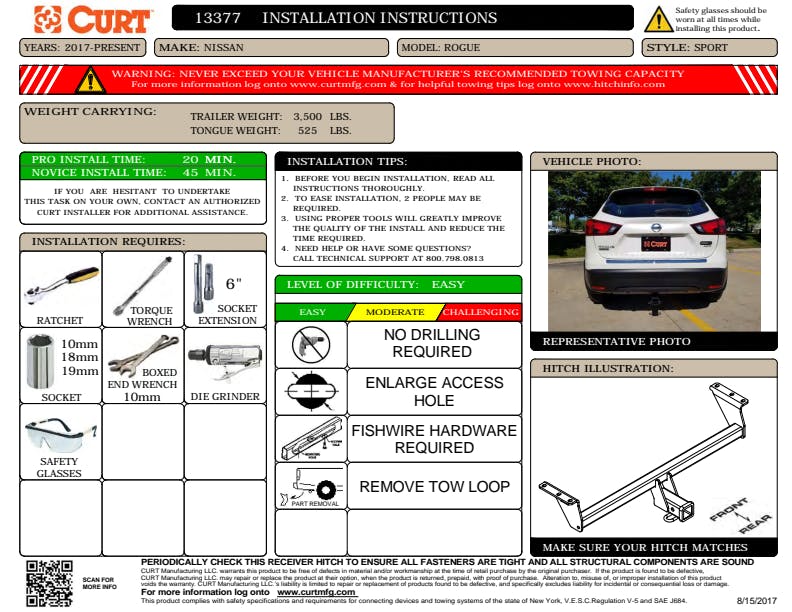 Whatever your task at hand -- whether it's launching that boat before daybreak, setting up your camper before the rush or getting a final load to the dump before close -- CURT class 3 trailer hitches offer the strength needed for serious towing. They make it easy to hitch up and Bring It, offering a vehicle-specific fit and the weight capacity to handle a variety of trailers. Custom class 3 hitches are the most common type of receiver hitch for pickup trucks and SUVs. Because of their weight range, they are also found on full-size cars, crossovers and minivans. Each custom-fit class 3 hitch package is made for vehicle-specific mounting. This particular kit fits certain years of the Nissan Qashqai and Rogue Sport (see application info to verify vehicle compatibility). It provides a weight carrying capacity of 3,500 lbs. GTW and 525 lbs. TW. CURT class 3 trailer hitches are typically used to attach and haul utility trailers, boat trailers, campers, snowmobile or ATV haulers and more (NOTE: Never exceed the lowest-rated towing component). Each class 3 hitch has a 2 receiver tube and is tested in accordance with SAE J684 for safety. To ensure that CURT class 3 receiver hitches have what it takes for serious trailering, they are designed using a hands-on approach and are constructed with rugged, high-strength steel and precise welding. We also protect our class 3 hitches in a co-cured finish of liquid A-coat and black powder coat for superior resistance to rust, chipping and UV damage.