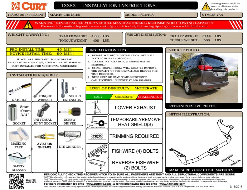 Whatever your task at hand -- whether it's launching that boat before daybreak, setting up your camper before the rush or getting a final load to the dump before close -- CURT class 3 trailer hitches offer the strength needed for serious towing. They make it easy to hitch up and Bring It, offering a vehicle-specific fit and the weight capacity to handle a variety of trailers. Custom class 3 hitches are the most common type of receiver hitch for pickup trucks and SUVs. Because of their weight range, they are also found on full-size cars, crossovers and minivans. Each custom-fit class 3 hitch package is made for vehicle-specific mounting. This particular kit fits certain years of the Chrysler Pacifica and Chrysler Voyager (see application info to verify vehicle compatibility). It provides a weight carrying capacity of 4,000 lbs. GTW and 400 lbs. TW. It is also compatible with a weight distribution hitch for level towing and a rating of 5,000 lbs. WD and 500 lbs. WDTW. CURT class 3 trailer hitches are typically used to attach and haul utility trailers, boat trailers, campers, snowmobile or ATV haulers and more (NOTE: Never exceed the lowest-rated towing component). Each class 3 hitch has a 2 receiver tube and is tested in accordance with SAE J684 for safety. To ensure that CURT class 3 receiver hitches have what it takes for serious trailering, they are designed using a hands-on approach and are constructed with rugged, high-strength steel and precise welding. We also protect our class 3 hitches in a co-cured finish of liquid A-coat and black powder coat for superior resistance to rust, chipping and UV damage.