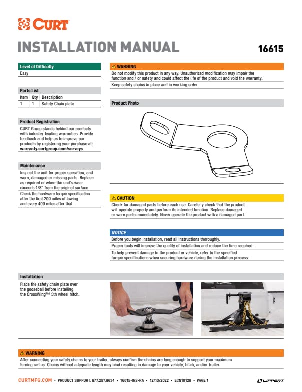 This 5th wheel safety chain anchor plate helps provide a backup connection between your truck and 5th wheel trailer. The bracket is designed to mount with your gooseneck ball in your truck bed, providing an anchoring point for your 5th wheel safety chains. This kit includes the bracket only (safety chain assembly #16613 is sold separately). It is designed to fit CrossWing models for single-point gooseneck hitches.