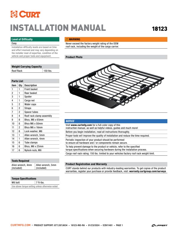 When it's time to embark on your journey, loading up your vehicle can become a game of Tetris. Even with a spacious car, fitting bulky items inside may lead to discomfort for passengers and pets. The CURT roof rack cargo carrier offers a convenient solution, allowing you to securely store large items outside the vehicle, freeing up space and ensuring a comfortable and organized interior for passengers and pets. Plus, it's also compatible with the CURT quick-release bike mount accessory (#18125) so you can easily secure your bike during travel. With the CURT roof rack cargo carrier, you gain an extra 11 sq. ft. of storage space atop your vehicle, and it's expandable to 17 sq. ft. when combined with the CURT cargo carrier extension (18124). Its cage-style design features a 5" deep basket, ideal for carrying bulky items, preventing shifting or falling while driving over inclines or rough roads. Constructed from durable tubular steel, the CURT roof rack cargo carrier boasts strength and longevity, with a carrying capacity of up to 200 lbs. The robust steel structure is treated with a protective E-coat, preventing rust, and finished with a tough carbide black powder coat, ensuring resilience against outdoor elements, dings, and scratches while maintaining an appealing appearance.
