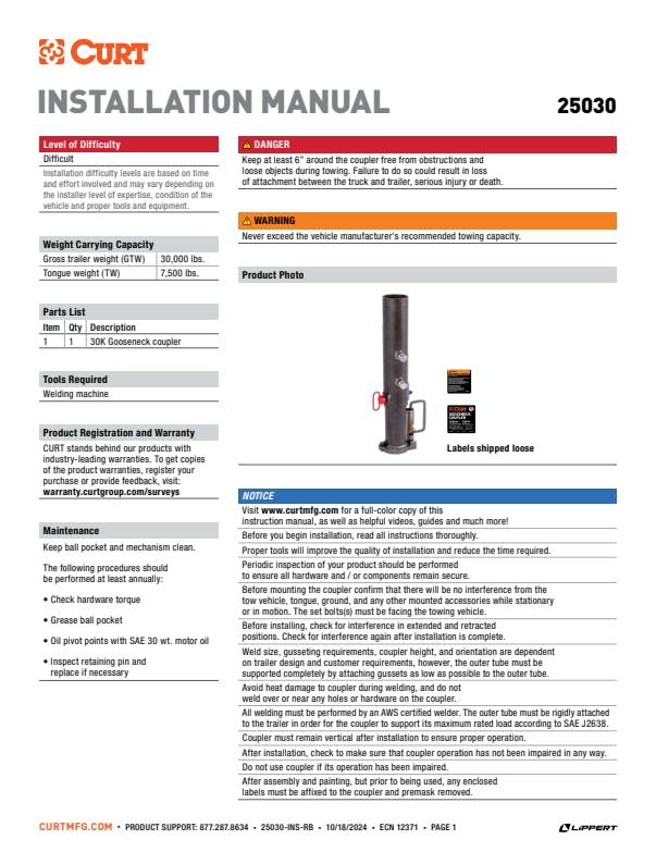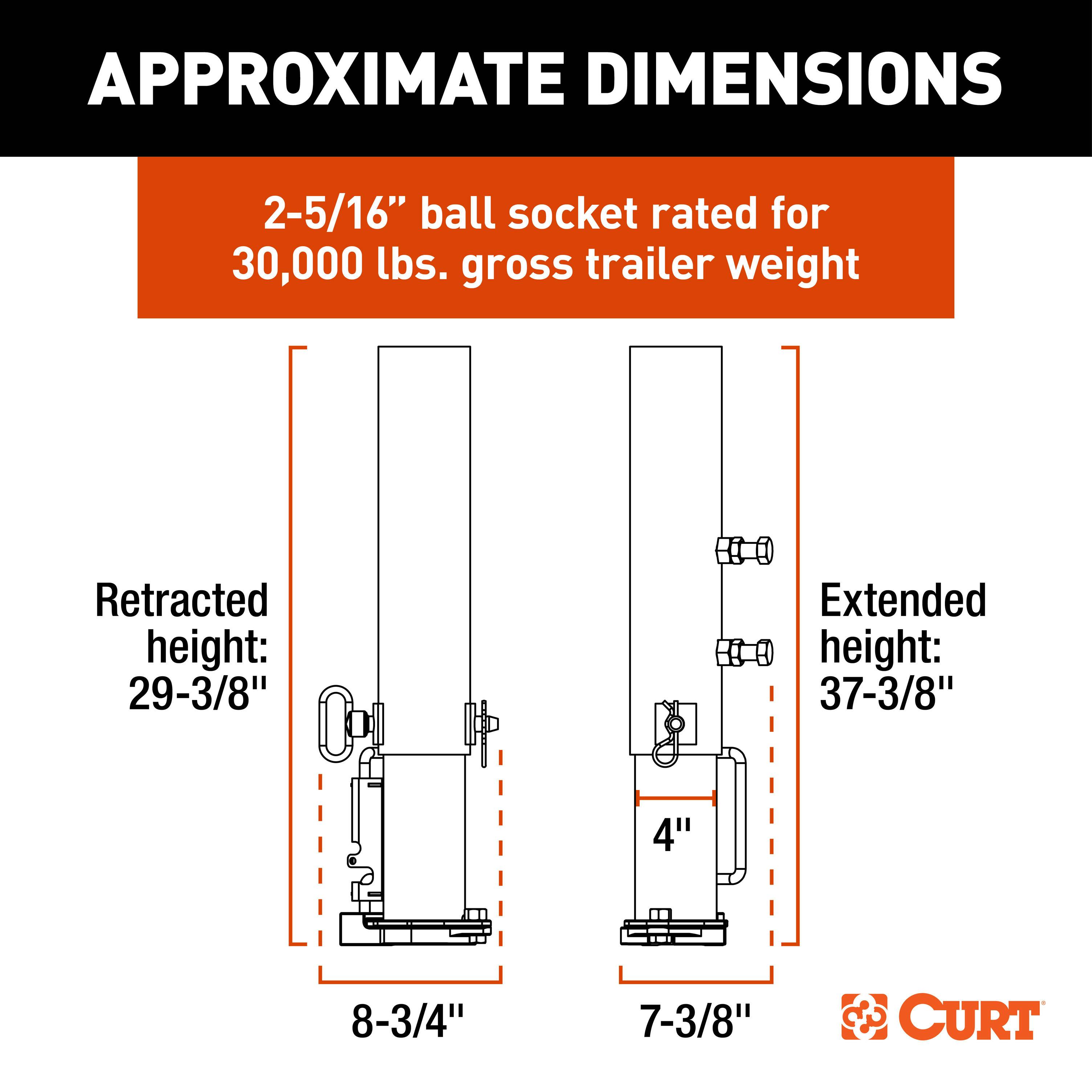 The CURT 2-5/16" Adjustable Gooseneck Coupler is engineered for high-strength towing and designed with convenience in mind. With a 2-5/16" ball socket rated for 30,000 lbs., it provides the reliable strength needed for heavy-duty hauling. Its adjustable height feature offers 8" of flexibility, with a retracted height of 29-1/3 inches, making it adaptable to various trailer setups. The self-centering locking plate ensures easier and quicker hookups, while the easy-access lock handle offers a secure and hassle-free connection every time. Compatible with most round-tube trailer tongues, this coupler is versatile and practical for a range of towing applications. Its reinforced material around the pin holes prevents elongation and reduces wear, extending the life of the coupler, while the durable steel construction ensures dependable towing strength. Safety-tested to meet SAE J2638 specifications, the coupler is designed to withstand the rigors of heavy-duty use. Whether you’re hauling equipment or livestock, the CURT Adjustable Gooseneck Coupler delivers reliable performance and long-lasting durability on every journey.