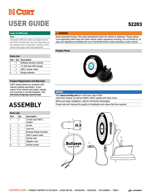 The CURT Bullseye Wireless Monitor for RVibrake gives you instant visibility into your towed vehicle’s braking performance with a vibrant 2.1” touchscreen display. Offering real-time feedback on braking force and battery charging, it keeps you informed and in control, no matter where your travels take you. Designed for enhanced safety and ease of use, the Bullseye Monitor features a manual braking button for quick adjustments, along with audible and visual alerts to keep you aware of braking activity. Its wireless connectivity ensures a clean, hassle-free setup, allowing you to focus on the road with confidence. Built for seamless compatibility, the Bullseye Monitor works effortlessly with RVibrake 4. With a 6’ USB-C cable, dual USB-C car charger, and range extender included, it delivers everything needed for a smooth and stress-free towing experience.