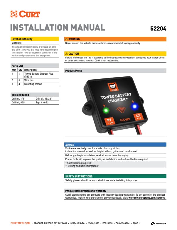 Many towed vehicles today have a large current draw on the battery when towing.?The CURT RVibrake towed battery charger plus?will prevent this unseen parasitic loss on your?towed vehicle battery. With multi-color LEDs that give instant feedback of your towed battery and charging voltage, you can safely tow your vehicle with confidence.