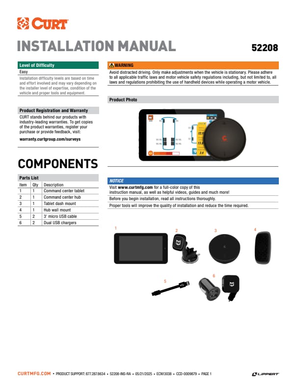The CURT 2-in-1 Dual USB AC/DC charger is a smart solution for charging your devices both on the road and at home. It combines the functions of a car charger and a wall adapter into one compact unit, so you don’t have to worry about carrying multiple chargers. With a total output of 3.1A and two USB ports, this charger can power up both your smartphone and Command Center tablet at their full charging speed, ensuring you stay connected and ready to go. This charger is built with smart protection to keep your devices safe from overheating, overcharging, and short circuits, so you can charge without concern. Its compact design, with a foldable plug, makes it easy to pack and take anywhere. A blue LED indicator lights up when the charger is active, helping you quickly spot it in the dark. Whether you're driving or at home, this charger is a reliable and efficient way to keep your devices powered up.
