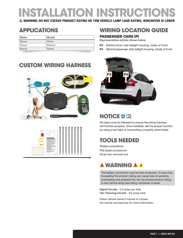 If your vehicle is not equipped with wiring for towing a trailer, CURT custom wiring is the ideal solution. A custom wiring harness -- also called a T-connector -- is a simple, plug-and-play electrical device that plugs into your automotive electric system and provides a standard, universal trailer wiring connection. This is done using two or more vehicle-specific, OEM-compatible connectors to plug into the taillight assembly, eliminating the need for cutting, splicing and soldering during installation. Custom wiring harnesses are made vehicle-specific, and while they are not available for all vehicles, they do offer one of the fastest, easiest and most secure ways to wire a vehicle for towing. This particular plug-in harness provides a 4-way flat connector socket and is designed to be a custom wiring harness to fit certain years of the Nissan Altima, Maxima and Sentra (to verify your vehicle compatibility, see application info). It comes with all necessary wiring components to establish a reliable trailer wiring connection, as well as a dust cover to keep the connector clean when not in use. You have a picture in mind of your next destination -- maybe it's the boat landing at your favorite fishing spot, maybe it's a campsite that overlooks one of nature's masterpieces, or maybe it's the next big jobsite. However, turning that picture into a reality takes more than just daydreaming. It takes a solid connection and the right amount of power. CURT custom wiring is made with some of the most sophisticated technology in the industry and is designed to install with ease, giving you a long-lasting electrical connection for your towing hitch setup.