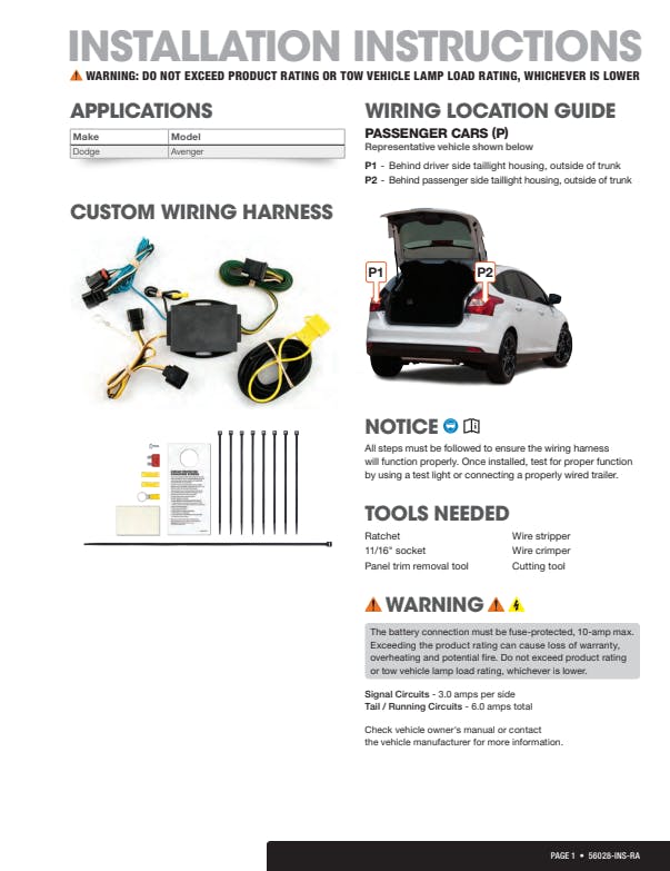 If your vehicle is not equipped with wiring for towing a trailer, CURT custom wiring is the ideal solution. A custom wiring harness -- also called a T-connector -- is a simple, plug-and-play electrical device that plugs into your automotive electric system and provides a standard, universal trailer wiring connection. This is done using two or more vehicle-specific, OEM-compatible connectors to plug into the taillight assembly, eliminating the need for cutting, splicing and soldering during installation. Custom wiring harnesses are made vehicle-specific, and while they are not available for all vehicles, they do offer one of the fastest, easiest and most secure ways to wire a vehicle for towing. This particular plug-in harness provides a 4-way flat connector socket and is designed to be a custom wiring harness to fit certain years of the Dodge Avenger (to verify your vehicle compatibility, see application info). It comes with all necessary wiring components to establish a reliable trailer wiring connection, as well as a dust cover to keep the connector clean when not in use. You have a picture in mind of your next destination -- maybe it's the boat landing at your favorite fishing spot, maybe it's a campsite that overlooks one of nature's masterpieces, or maybe it's the next big jobsite. However, turning that picture into a reality takes more than just daydreaming. It takes a solid connection and the right amount of power. CURT custom wiring is made with some of the most sophisticated technology in the industry and is designed to install with ease, giving you a long-lasting electrical connection for your towing hitch setup.