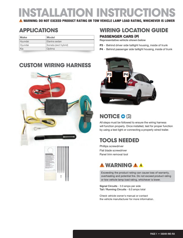 If your vehicle is not equipped with wiring for towing a trailer, CURT custom wiring is the ideal solution. A custom wiring harness -- also called a T-connector -- is a simple, plug-and-play electrical device that plugs into your automotive electric system and provides a standard, universal trailer wiring connection. This is done using two or more vehicle-specific, OEM-compatible connectors to plug into the taillight assembly, eliminating the need for cutting, splicing and soldering during installation. Custom wiring harnesses are made vehicle-specific, and while they are not available for all vehicles, they do offer one of the fastest, easiest and most secure ways to wire a vehicle for towing. This particular plug-in harness provides a 4-way flat connector socket and is designed to be a custom wiring harness to fit certain years of the Hyundai Elantra sedan, Hyundai Sonata and Kia Optima sedan (to verify your vehicle compatibility, see application info). It comes with all necessary wiring components to establish a reliable trailer wiring connection, as well as a dust cover to keep the connector clean when not in use. You have a picture in mind of your next destination -- maybe it's the boat landing at your favorite fishing spot, maybe it's a campsite that overlooks one of nature's masterpieces, or maybe it's the next big jobsite. However, turning that picture into a reality takes more than just daydreaming. It takes a solid connection and the right amount of power. CURT custom wiring is made with some of the most sophisticated technology in the industry and is designed to install with ease, giving you a long-lasting electrical connection for your towing hitch setup.