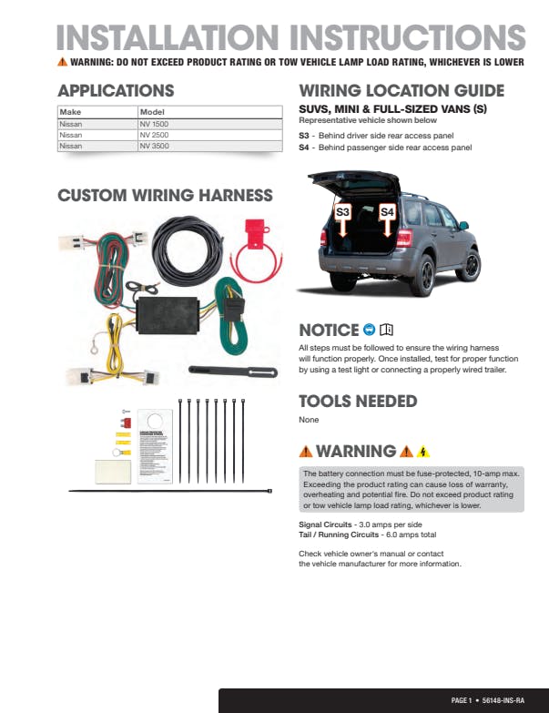 If your vehicle is not equipped with wiring for towing a trailer, CURT custom wiring is the ideal solution. A custom wiring harness -- also called a T-connector -- is a simple, plug-and-play electrical device that plugs into your automotive electric system and provides a standard, universal trailer wiring connection. This is done using two or more vehicle-specific, OEM-compatible connectors to plug into the taillight assembly, eliminating the need for cutting, splicing and soldering during installation. Custom wiring harnesses are made vehicle-specific, and while they are not available for all vehicles, they do offer one of the fastest, easiest and most secure ways to wire a vehicle for towing. This particular plug-in harness provides a 4-way flat connector socket and is designed to be a custom wiring harness to fit certain years of the Nissan NV1500, NV2500 and NV3500 (to verify your vehicle compatibility, see application info). It comes with all necessary wiring components to establish a reliable trailer wiring connection, as well as a dust cover to keep the connector clean when not in use. You have a picture in mind of your next destination -- maybe it's the boat landing at your favorite fishing spot, maybe it's a campsite that overlooks one of nature's masterpieces, or maybe it's the next big jobsite. However, turning that picture into a reality takes more than just daydreaming. It takes a solid connection and the right amount of power. CURT custom wiring is made with some of the most sophisticated technology in the industry and is designed to install with ease, giving you a long-lasting electrical connection for your towing hitch setup.