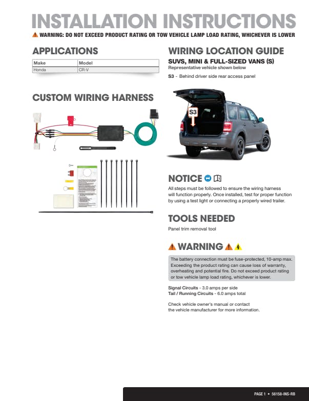 If your vehicle is not equipped with wiring for towing a trailer, CURT custom wiring is the ideal solution. A custom wiring harness -- also called a T-connector -- is a simple, plug-and-play electrical device that plugs into your automotive electric system and provides a standard, universal trailer wiring connection. This is done using two or more vehicle-specific, OEM-compatible connectors to plug into the taillight assembly, eliminating the need for cutting, splicing and soldering during installation. Custom wiring harnesses are made vehicle-specific, and while they are not available for all vehicles, they do offer one of the fastest, easiest and most secure ways to wire a vehicle for towing. This particular plug-in harness provides a 4-way flat connector socket and is designed to be a custom wiring harness to fit certain years of the Honda CRV (to verify your vehicle compatibility, see application info). It comes with all necessary wiring components to establish a reliable trailer wiring connection, as well as a dust cover to keep the connector clean when not in use. You have a picture in mind of your next destination -- maybe it's the boat landing at your favorite fishing spot, maybe it's a campsite that overlooks one of nature's masterpieces, or maybe it's the next big jobsite. However, turning that picture into a reality takes more than just daydreaming. It takes a solid connection and the right amount of power. CURT custom wiring is made with some of the most sophisticated technology in the industry and is designed to install with ease, giving you a long-lasting electrical connection for your towing hitch setup.