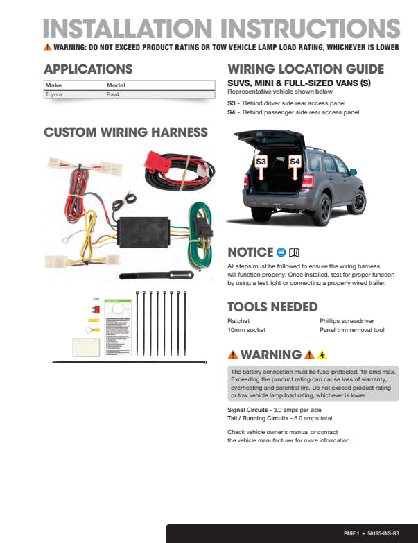 If your vehicle is not equipped with wiring for towing a trailer, CURT custom wiring is the ideal solution. A custom wiring harness -- also called a T-connector -- is a simple, plug-and-play electrical device that plugs into your automotive electric system and provides a standard, universal trailer wiring connection. This is done using two or more vehicle-specific, OEM-compatible connectors to plug into the taillight assembly, eliminating the need for cutting, splicing and soldering during installation. Custom wiring harnesses are made vehicle-specific, and while they are not available for all vehicles, they do offer one of the fastest, easiest and most secure ways to wire a vehicle for towing. This particular plug-in harness provides a 4-way flat connector socket and is designed to be a custom wiring harness to fit certain years of the Toyota RAV4 (to verify your vehicle compatibility, see application info). It comes with all necessary wiring components to establish a reliable trailer wiring connection, as well as a dust cover to keep the connector clean when not in use. You have a picture in mind of your next destination -- maybe it's the boat landing at your favorite fishing spot, maybe it's a campsite that overlooks one of nature's masterpieces, or maybe it's the next big jobsite. However, turning that picture into a reality takes more than just daydreaming. It takes a solid connection and the right amount of power. CURT custom wiring is made with some of the most sophisticated technology in the industry and is designed to install with ease, giving you a long-lasting electrical connection for your towing hitch setup.