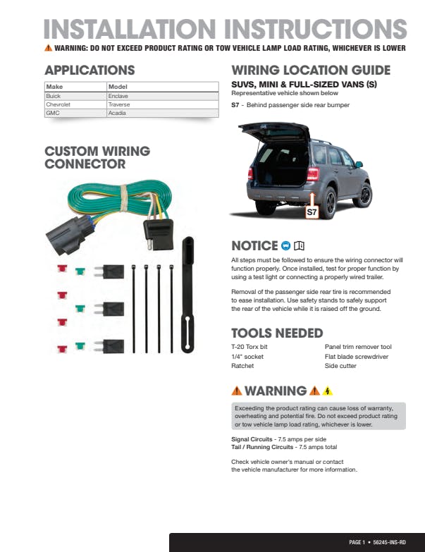 CURT custom wiring connectors are the easiest way to outfit your vehicle with a CURT trailer wiring connection. They are built with some of the most advanced technology in the industry, and each one is custom-fitted to work with a specific make and model. Some automotive manufacturers install a special socket on the vehicle to be used for vehicle-to-trailer wiring. Although this special socket is not equipped on every vehicle, a CURT custom wiring connector -- also called a T-connector -- utilizes the socket for simple, stress-free installation. Rather than requiring you to cut, splice and solder into your vehicle's wiring system, the custom wiring connector uses a single OEM-compatible plug and instantly provides a standard, universal vehicle-to-trailer wiring connection, typically in the form a 4-way flat. All CURT custom wiring connectors are made vehicle-specific for the easiest possible installation and the best fit. This particular plug-in connector provides a 4-way flat socket and is designed to be a custom wiring option for certain years of the Chevy Traverse, GMC Acadia and Buick Enclave (factory tow package required; to verify your vehicle compatibility, see application info). It comes with all necessary hardware to establish a solid connection. It also comes with a dust cover to keep the connector socket clean when not in use. To ensure long-lasting reliability, all CURT custom wiring connectors are thoroughly tested for optimal functionality. Stress is the last thing you should feel when towing a trailer -- whether you're hauling your RV to that favorite camping destination, your ATVs up to the hunting grounds or your fishing boat to the new hidden hotspot. At CURT, we think your towing equipment should add to the enjoyment of your experience, not detract from it.