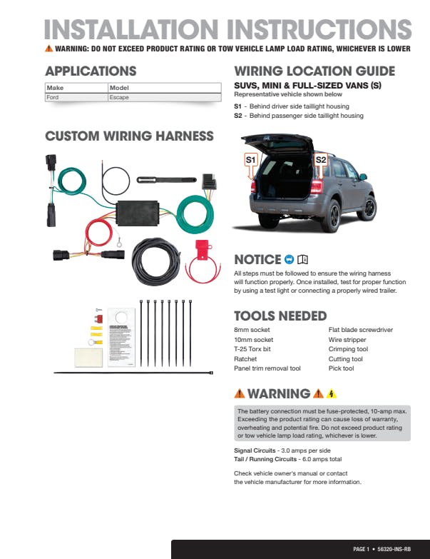 If your vehicle is not equipped with wiring for towing a trailer, CURT custom wiring is the ideal solution. A custom wiring harness -- also called a T-connector -- is a simple, plug-and-play electrical device that plugs into your automotive electric system and provides a standard, universal trailer wiring connection. This is done using two or more vehicle-specific, OEM-compatible connectors to plug into the taillight assembly, eliminating the need for cutting, splicing and soldering during installation. Custom wiring harnesses are made vehicle-specific, and while they are not available for all vehicles, they do offer one of the fastest, easiest and most secure ways to wire a vehicle for towing. This particular plug-in harness provides a 4-way flat connector socket and is designed to be a custom wiring harness to fit certain years of the Ford Escape (to verify your vehicle compatibility, see application info). It comes with all necessary wiring components to establish a reliable trailer wiring connection, as well as a dust cover to keep the connector clean when not in use. You have a picture in mind of your next destination -- maybe it's the boat landing at your favorite fishing spot, maybe it's a campsite that overlooks one of nature's masterpieces, or maybe it's the next big jobsite. However, turning that picture into a reality takes more than just daydreaming. It takes a solid connection and the right amount of power. CURT custom wiring is made with some of the most sophisticated technology in the industry and is designed to install with ease, giving you a long-lasting electrical connection for your towing hitch setup.