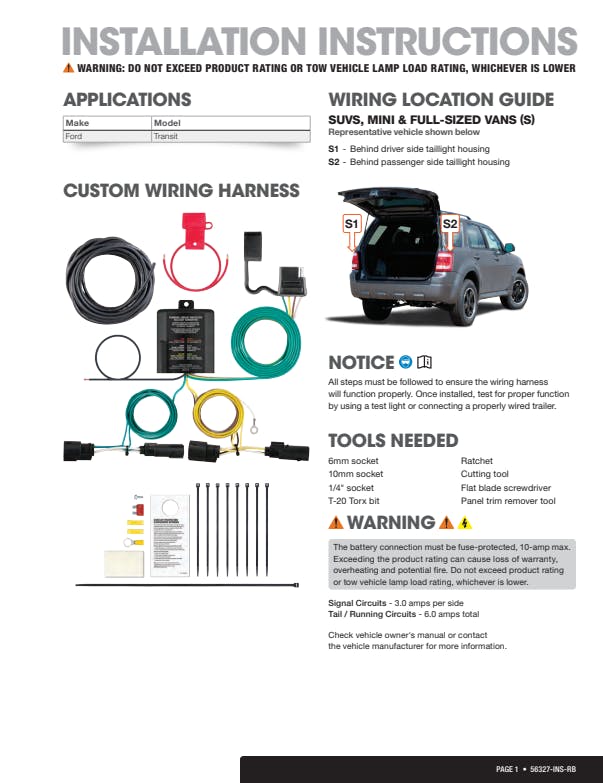 If your vehicle is not equipped with wiring for towing a trailer, CURT custom wiring is the ideal solution. A custom wiring harness -- also called a T-connector -- is a simple, plug-and-play electrical device that plugs into your automotive electric system and provides a standard, universal trailer wiring connection. This is done using two or more vehicle-specific, OEM-compatible connectors to plug into the taillight assembly, eliminating the need for cutting, splicing and soldering during installation. Custom wiring harnesses are made vehicle-specific, and while they are not available for all vehicles, they do offer one of the fastest, easiest and most secure ways to wire a vehicle for towing. This particular plug-in harness provides a 4-way flat connector socket and is designed to be a custom wiring harness to fit certain years of the Ford Transit150, Transit250, Transit350 and Transit350 HD (to verify your vehicle compatibility, see application info). It comes with all necessary wiring components to establish a reliable trailer wiring connection, as well as a dust cover to keep the connector clean when not in use. You have a picture in mind of your next destination -- maybe it's the boat landing at your favorite fishing spot, maybe it's a campsite that overlooks one of nature's masterpieces, or maybe it's the next big jobsite. However, turning that picture into a reality takes more than just daydreaming. It takes a solid connection and the right amount of power. CURT custom wiring is made with some of the most sophisticated technology in the industry and is designed to install with ease, giving you a long-lasting electrical connection for your towing hitch setup.