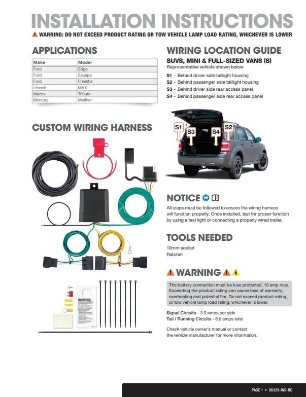 If your vehicle is not equipped with wiring for towing a trailer, CURT custom wiring is the ideal solution. A custom wiring harness -- also called a T-connector -- is a simple, plug-and-play electrical device that plugs into your automotive electric system and provides a standard, universal trailer wiring connection. This is done using two or more vehicle-specific, OEM-compatible connectors to plug into the taillight assembly, eliminating the need for cutting, splicing and soldering during installation. Custom wiring harnesses are made vehicle-specific, and while they are not available for all vehicles, they do offer one of the fastest, easiest and most secure ways to wire a vehicle for towing. This particular plug-in harness provides a 4-way flat connector socket and is designed to be a custom wiring harness to fit certain years of the Ford Edge, Ford Escape, Ford Freestar, Lincoln MKX, Mazda Tribute and Mercury Mariner (to verify your vehicle compatibility, see application info). It comes with all necessary wiring components to establish a reliable trailer wiring connection, as well as a dust cover to keep the connector clean when not in use. You have a picture in mind of your next destination -- maybe it's the boat landing at your favorite fishing spot, maybe it's a campsite that overlooks one of nature's masterpieces, or maybe it's the next big jobsite. However, turning that picture into a reality takes more than just daydreaming. It takes a solid connection and the right amount of power. CURT custom wiring is made with some of the most sophisticated technology in the industry and is designed to install with ease, giving you a long-lasting electrical connection for your towing hitch setup.