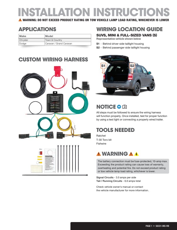 If your vehicle is not equipped with wiring for towing a trailer, CURT custom wiring is the ideal solution. A custom wiring harness -- also called a T-connector -- is a simple, plug-and-play electrical device that plugs into your automotive electric system and provides a standard, universal trailer wiring connection. This is done using two or more vehicle-specific, OEM-compatible connectors to plug into the taillight assembly, eliminating the need for cutting, splicing and soldering during installation. Custom wiring harnesses are made vehicle-specific, and while they are not available for all vehicles, they do offer one of the fastest, easiest and most secure ways to wire a vehicle for towing. This particular plug-in harness provides a 4-way flat connector socket and is designed to be a custom wiring harness to fit certain years of the Chrysler Town and Country and Dodge Grand Caravan (to verify your vehicle compatibility, see application info). It comes with all necessary wiring components to establish a reliable trailer wiring connection, as well as a dust cover to keep the connector clean when not in use. You have a picture in mind of your next destination -- maybe it's the boat landing at your favorite fishing spot, maybe it's a campsite that overlooks one of nature's masterpieces, or maybe it's the next big jobsite. However, turning that picture into a reality takes more than just daydreaming. It takes a solid connection and the right amount of power. CURT custom wiring is made with some of the most sophisticated technology in the industry and is designed to install with ease, giving you a long-lasting electrical connection for your towing hitch setup.