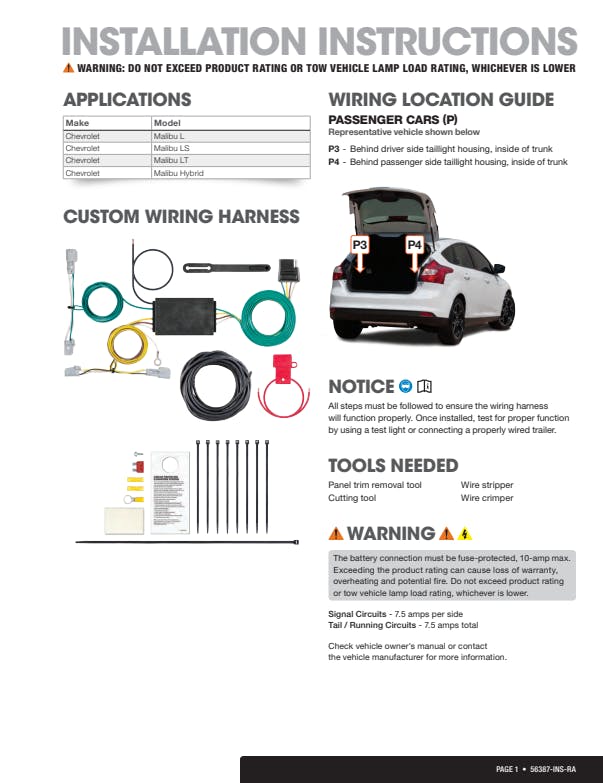 If your vehicle is not equipped with wiring for towing a trailer, CURT custom wiring is the ideal solution. A custom wiring harness -- also called a T-connector -- is a simple, plug-and-play electrical device that plugs into your automotive electric system and provides a standard, universal trailer wiring connection. This is done using two or more vehicle-specific, OEM-compatible connectors to plug into the taillight assembly, eliminating the need for cutting, splicing and soldering during installation. Custom wiring harnesses are made vehicle-specific, and while they are not available for all vehicles, they do offer one of the fastest, easiest and most secure ways to wire a vehicle for towing. This particular plug-in harness provides a 4-way flat connector socket and is designed to be a custom wiring harness to fit certain years of the Chevy Malibu (to verify your vehicle compatibility, see application info). It comes with all necessary wiring components to establish a reliable trailer wiring connection, as well as a dust cover to keep the connector clean when not in use. You have a picture in mind of your next destination -- maybe it's the boat landing at your favorite fishing spot, maybe it's a campsite that overlooks one of nature's masterpieces, or maybe it's the next big jobsite. However, turning that picture into a reality takes more than just daydreaming. It takes a solid connection and the right amount of power. CURT custom wiring is made with some of the most sophisticated technology in the industry and is designed to install with ease, giving you a long-lasting electrical connection for your towing hitch setup.