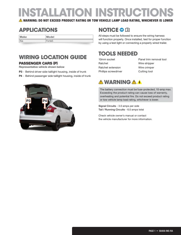 If your vehicle is not equipped with wiring for towing a trailer, CURT custom wiring is the ideal solution. A custom wiring harness -- also called a T-connector -- is a simple, plug-and-play electrical device that plugs into your automotive electric system and provides a standard, universal trailer wiring connection. This is done using two or more vehicle-specific, OEM-compatible connectors to plug into the taillight assembly, eliminating the need for cutting, splicing and soldering during installation. Custom wiring harnesses are made vehicle-specific, and while they are not available for all vehicles, they do offer one of the fastest, easiest and most secure ways to wire a vehicle for towing. This particular plug-in harness provides a 4-way flat connector socket and is designed to be a custom wiring harness to fit certain years of the Kia Forte5 (to verify your vehicle compatibility, see application info). It comes with all necessary wiring components to establish a reliable trailer wiring connection, as well as a dust cover to keep the connector clean when not in use. You have a picture in mind of your next destination -- maybe it's the boat landing at your favorite fishing spot, maybe it's a campsite that overlooks one of nature's masterpieces, or maybe it's the next big jobsite. However, turning that picture into a reality takes more than just daydreaming. It takes a solid connection and the right amount of power. CURT custom wiring is made with some of the most sophisticated technology in the industry and is designed to install with ease, giving you a long-lasting electrical connection for your towing hitch setup.