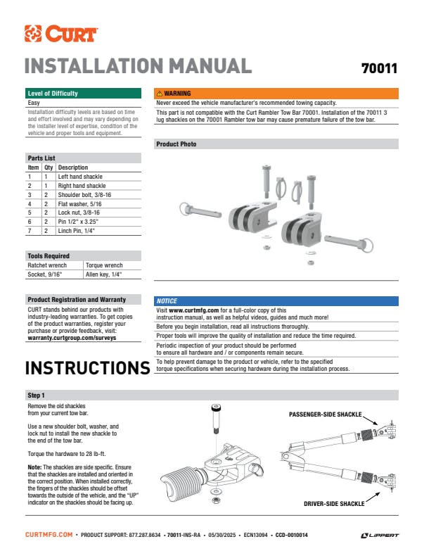 - Designed to fit CURT Rambler Tow Bar (#70015) and Seeker (#70012)