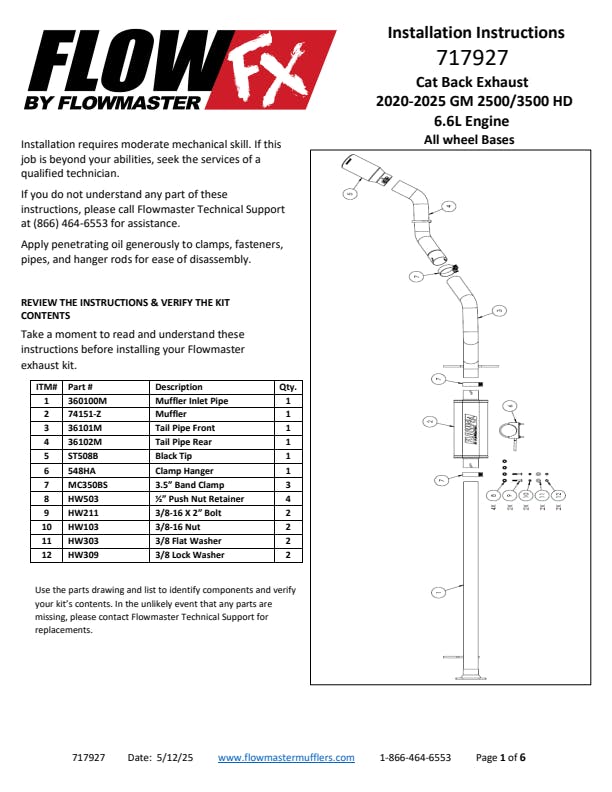 Flowmaster's® Flow FX Cat-Back exhaust system for the 2020-2026 GM 2500HD and 3500HD trucks with the 6.6L gas engines gives you a great way to help you customize your GM truck to your personality. This performance exhaust system fits both 2/4 Wheel drive models and is manufactured from 409 stainless steel for years of trouble-free service and performance. Features include a 3.50-inch inlet pipe leading into a 409 stainless steel Flow FX series "straight-through" muffler for great sound and maximum performance and no drone. The muffler then connects to the factory tailpipe for a simple and effective performance upgrade. Max dyno gains of 11 hp and 10 lb-ft at the rear wheels. This results in better acceleration and towing performance. The system uses all the factory hanger locations and connections for an easy installation that you can do at home. Kits include installation instructions and all necessary hardware. Backed by Flowmaster's Lifetime Limited Warranty.