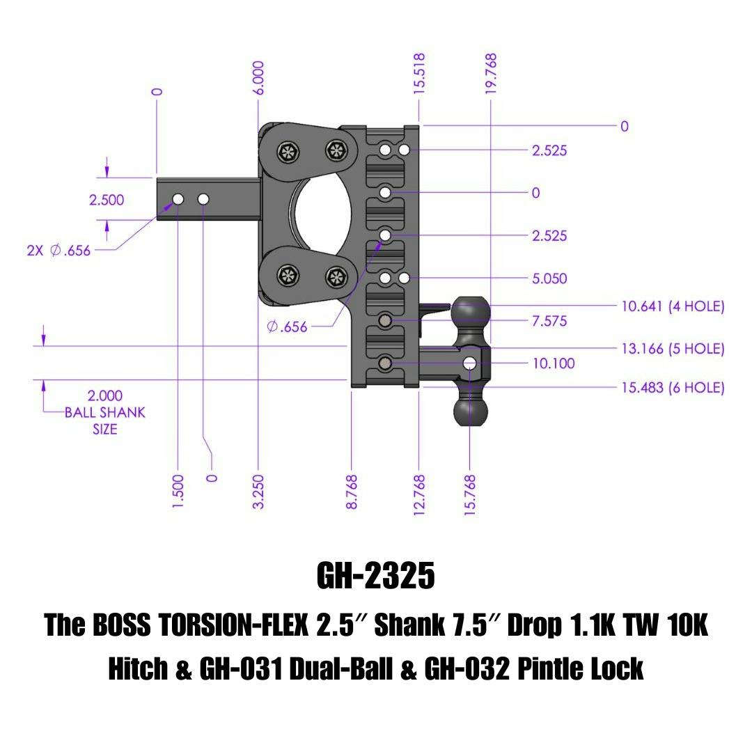 The BOSS TORSION-FLEX 2.5" Shank 7.5" Drop 1.1K TW 10K Hitch & GH-031 Dual-Ball & GH-032 Pintle Lock