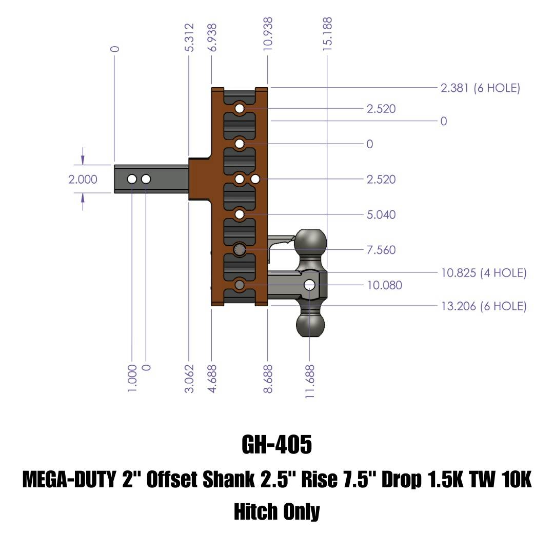 GEN-Y's Mega-Duty Adjustable Drop Hitches start at 10,000 LB towing capacity and go up to 32,000 LB towing capacity. There are multiple drop options as well depending on your trailer towing needs.