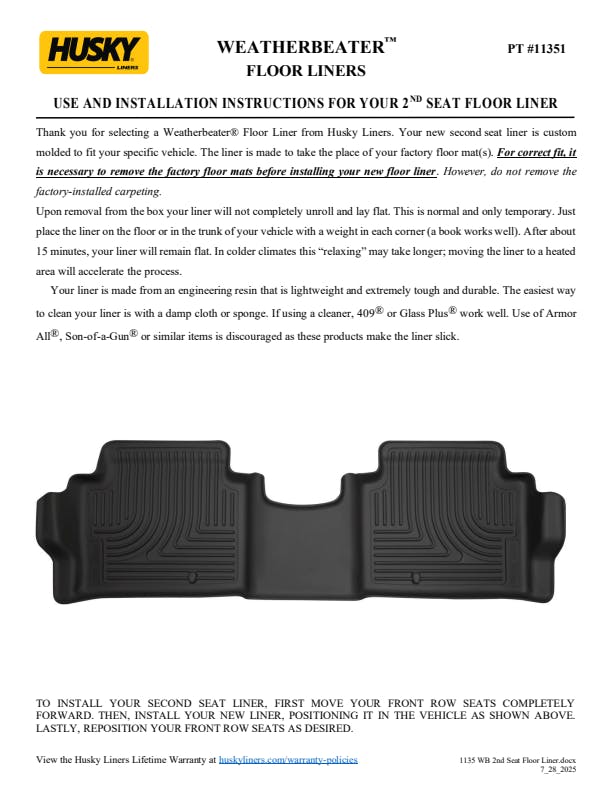 - WeatherBeater(TM) Liners offer protection that extends all the way to your rear seats. So go ahead, lift the seats and leave them up, load after load. Husky's got your floors, and your back, no matter what the road brings your way.