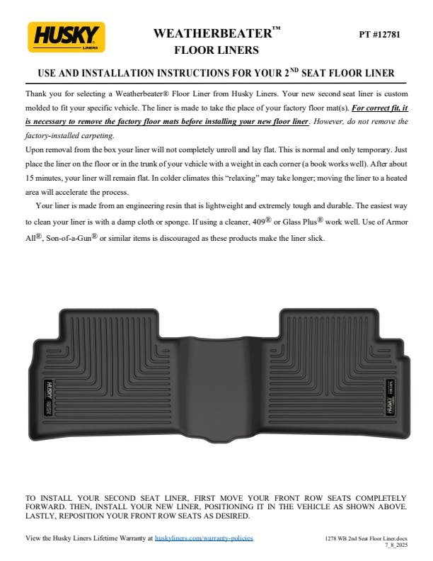 • WeatherBeater(TM) Liners offer protection that extends all the way to your rear seats. So go ahead, lift the seats and leave them up, load after load. Husky's got your floors, and your back, no matter what the road brings your way.