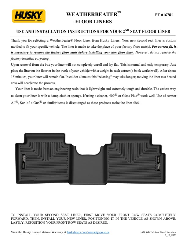 - WeatherBeater(TM) Liners offer protection that extends all the way to your rear seats. So go ahead, lift the seats and leave them up, load after load. Husky's got your floors, and your back, no matter what the road brings your way.