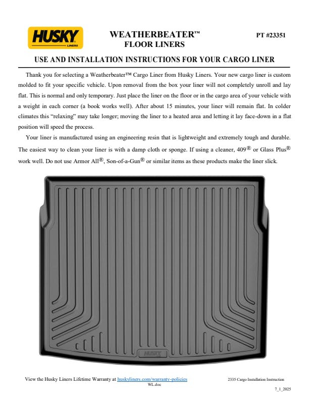 The original all-weather liner is ready, come hell or hot coffee. The Weatherbeater?s construction is a no-slip zone with zero edge curl, and its Stay Put Nibs keep it firmly anchored underfoot. It stands up to chemicals like gas, oil and battery acid, and stays tough and flexible, even under extreme temperatures. Its laser-scanned, FormFit Design? gives your truck, van or SUV an ultra-clean look with easy cleanup to match, while its patented, FormFit Edge? keeps spills contained, carpets unstained. It?s unbeatable Husky protection for life, warrantied the same. Proudly made in the USA.