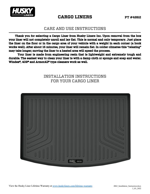 No hassle lifetime guarantee. For details: HuskyLiners.com/ForLife, Our Cargo Liners are made from a proprietary material blend that is sporty and rugged., Our Cargo Liners are ridiculously easy to install, remove, and clean., Sporty, rugged, and built for a lifetime of non-stop abuse. Put unbeatable all-weather toughness to work on your floor., Made in the USA., When we say it's "guaranteed for life" that is exactly what we mean. No hassles, no guff. If you have a problem with this or any Husky product, we'll replace it., Proudly made in the USA., Easy to install, remove, and clean. Just yank it out, hose it down and carry on. |