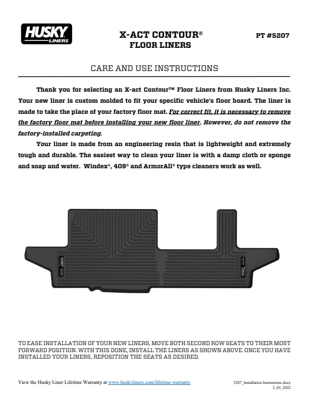 Thinner plastic floor mats warp and curl over time. X-act Contour® is engineered to stay true to the shape of your floorboards for life. It's strong yet pliable material is easy to revove and clean no matter what comes down., Our FormFit Design™ process perfectly forms each liner to the detailed contours of your specific ride. How? Well... our Nerds use lasers and computers to precisely measure each individual make and model's floorboard to create the perfect fit., With the perfect balance of strength and softness, our rubberized DuraGrip™ material delivers no-slip, no-slide, driving confidence no matter what the road brings., Our patented FormFit Edge™ features a raised ridge that runs along the door jam, protecting your truck, van, or SUV from all manner of muck., Over vinyl or carpet, our StayPut™ Cleats firmly lock to your factory anchors. It's rock-steady stability underfoot, only by Husky., When we say it's "guaranteed for life" that is exactly what we mean. No hassles, no guff. If you have a problem with this or any Husky product, we'll replace it., Folds and molds for easy installation, removal and cleanup. Just yank it out, spray it down, and carry on., Proudly made in the USA. |