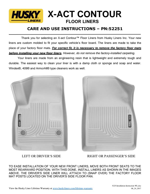Thinner plastic floor mats warp and curl over time. X-act Contour® is engineered to stay true to the shape of your floorboards for life. It's strong yet pliable material is easy to revove and clean no matter what comes down., Our FormFit Design™ process perfectly forms each liner to the detailed contours of your specific ride. How? Well... our Nerds use lasers and computers to precisely measure each individual make and model's floorboard to create the perfect fit., With the perfect balance of strength and softness, our rubberized DuraGrip™ material delivers no-slip, no-slide, driving confidence no matter what the road brings., Our patented FormFit Edge™ features a raised ridge that runs along the door jam, protecting your truck, van, or SUV from all manner of muck., Over vinyl or carpet, our StayPut™ Cleats firmly lock to your factory anchors. It's rock-steady stability underfoot, only by Husky., When we say it's "guaranteed for life" that is exactly what we mean. No hassles, no guff. If you have a problem with this or any Husky product, we'll replace it., Folds and molds for easy installation, removal and cleanup. Just yank it out, spray it down, and carry on., Proudly made in the USA. |