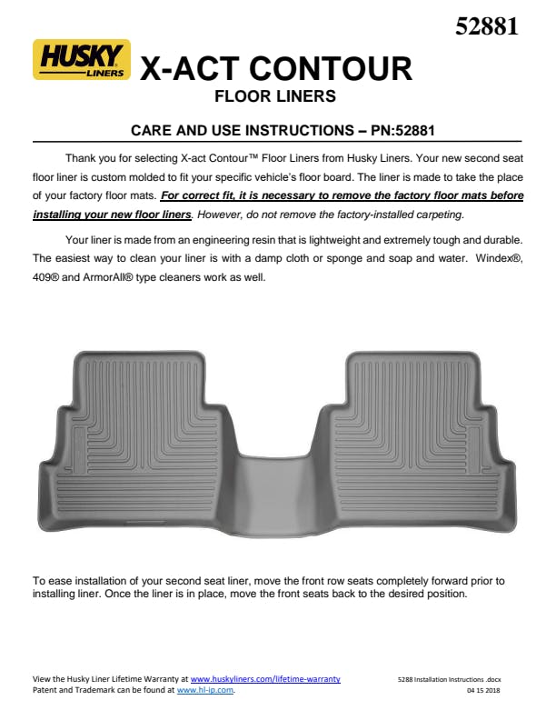 Our FormFit Design™ process perfectly forms each liner to the detailed contours of your specific ride., With both softness and strength, our rubberized DuraGrip™ material was designed with comfort in mind., Our exclusive StayPut Cleats™ help keep your liners securely in place., Made in the USA., No hassle lifetime guarantee. For details: HuskyLiners.com/ForLife, When we say it's "guaranteed for life" that is exactly what we mean. No hassles, no guff. If you have a problem with this or any Husky product, we'll replace it., Folds and molds for easy installation, removal and cleanup. Just yank it out, spray it down, and carry on., Proudly made in the USA., Our patented FormFit Edge™ is a raised ridge that runs along the door jam, protecting your truck or SUV from all manner of mess. |