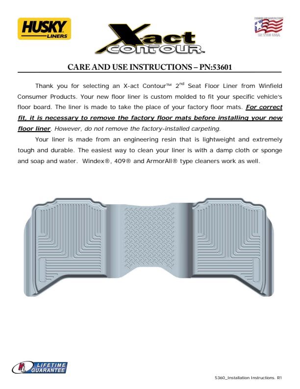 Thinner plastic floor mats warp and curl over time. X-act Contour® is engineered to stay true to the shape of your floorboards for life. It's strong yet pliable material is easy to revove and clean no matter what comes down., Our FormFit Design™ process perfectly forms each liner to the detailed contours of your specific ride. How? Well... our Nerds use lasers and computers to precisely measure each individual make and model's floorboard to create the perfect fit., With the perfect balance of strength and softness, our rubberized DuraGrip™ material delivers no-slip, no-slide, driving confidence no matter what the road brings., Our patented FormFit Edge™ features a raised ridge that runs along the door jam, protecting your truck, van, or SUV from all manner of muck., Over vinyl or carpet, our StayPut™ Cleats firmly lock to your factory anchors. It's rock-steady stability underfoot, only by Husky., When we say it's "guaranteed for life" that is exactly what we mean. No hassles, no guff. If you have a problem with this or any Husky product, we'll replace it., Folds and molds for easy installation, removal and cleanup. Just yank it out, spray it down, and carry on., Proudly made in the USA., Protection with a flexible comfortable soft feel prevents stains & soiling. |