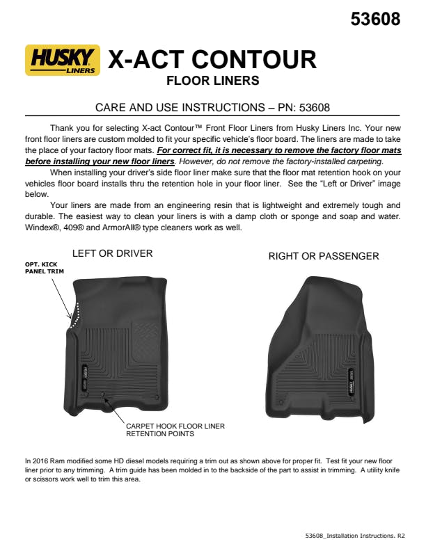 Nothing fits your vehicle better or protects longer than Husky X-act Contour?. These liners combine laser-scanned, exact fit with a no-slip, DuraGrip? surface and a softer feel. Plus, the rock-solid stability delivered by your vehicle?s factory retention posts, and our StayPut? Nibs for a no-slip, no-slide, surface with absolutely zero compromise in protection. They?re built to stand up to whatever you?re laying down? including chemicals like battery acid and oil, with our FormFit Edge? to keep whatever spills contained for easy cleanup. Available in black. Built for a lifetime of rugged abuse, warrantees the same.