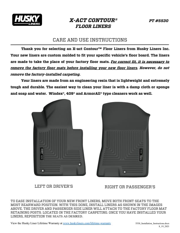Nothing fits your vehicle better or protects longer than Husky X-act Contour?. These liners combine laser-scanned, exact fit with a no-slip, DuraGrip? surface and a softer feel. Plus, the rock-solid stability delivered by your vehicle?s factory retention posts, and our StayPut? Nibs for a no-slip, no-slide, surface with absolutely zero compromise in protection. They?re built to stand up to whatever you?re laying down? including chemicals like battery acid and oil, with our FormFit Edge? to keep whatever spills contained for easy cleanup. Available in black. Built for a lifetime of rugged abuse, warrantees the same.