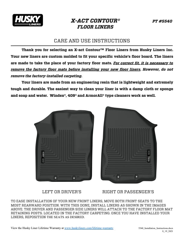 Nothing fits your vehicle better or protects longer than Husky X-act Contour?. These liners combine laser-scanned, exact fit with a no-slip, DuraGrip? surface and a softer feel. Plus, the rock-solid stability delivered by your vehicle?s factory retention posts, and our StayPut? Nibs for a no-slip, no-slide, surface with absolutely zero compromise in protection. They?re built to stand up to whatever you?re laying down? including chemicals like battery acid and oil, with our FormFit Edge? to keep whatever spills contained for easy cleanup. Available in black. Built for a lifetime of rugged abuse, warrantees the same.