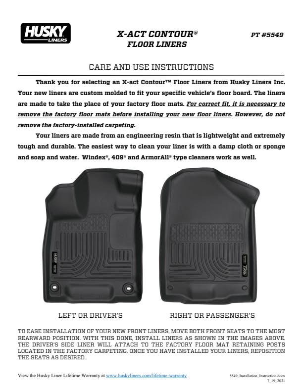 Nothing fits your vehicle better or protects longer than Husky X-act Contour?. These liners combine laser-scanned, exact fit with a no-slip, DuraGrip? surface and a softer feel. Plus, the rock-solid stability delivered by your vehicle?s factory retention posts, and our StayPut? Nibs for a no-slip, no-slide, surface with absolutely zero compromise in protection. They?re built to stand up to whatever you?re laying down? including chemicals like battery acid and oil, with our FormFit Edge? to keep whatever spills contained for easy cleanup. Available in black. Built for a lifetime of rugged abuse, warrantees the same.