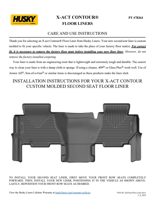 Nothing fits your vehicle better or protects longer than Husky X-act Contour?. These liners combine laser-scanned, exact fit with a no-slip, DuraGrip? surface and a softer feel. Plus, the rock-solid stability delivered by your vehicle?s factory retention posts, and our StayPut? Nibs for a no-slip, no-slide, surface with absolutely zero compromise in protection. They?re built to stand up to whatever you?re laying down? including chemicals like battery acid and oil, with our FormFit Edge? to keep whatever spills contained for easy cleanup. Available in black. Built for a lifetime of rugged abuse, warrantees the same.