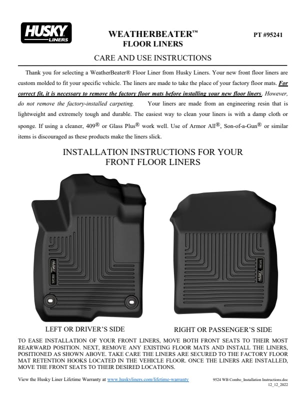 Features and Benefits Our patented FormFit Design™ process gives you a glove-like, laser-tight ?t to your make and model. Floorboards are 3D scanned to precisely match the contours of your vehicle., Our patented FormFit Edge™ features a raised ridge that runs along the door jam, protecting your truck, van, or SUV from all manner of muck., Over vinyl or carpet, our StayPut™ Cleats firmly lock to your factory anchors. It's rock-steady stability underfoot, only by Husky., Sporty, rugged, and built for a lifetime of non-stop abuse. Put unbeatable all-weather toughness to work on your floor., For applicable trucks, WeatherBeater™ Liners offer protection that extends all the way to your rear seats. So go ahead, lift the seats and leave them up, load after load. Husky's got your floors, and your back, no matter what the road brings your way., When we say it's "guaranteed for life" that is exactly what we mean. No hassles, no guff. If you have a problem with this or any Husky product, we'll replace it., Proudly made in the USA., Easy to install, remove, and clean. Just yank it out, hose it down and carry on.