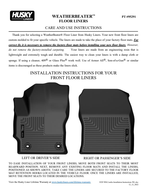 No hassle lifetime guarantee. For details: HuskyLiners.com/ForLife, Our exclusive StayPut Cleats™ help keep your liners securely in place., Our FormFit Design™ process perfectly forms each liner to the detailed contours of your specific ride., Sporty, rugged, and built for a lifetime of non-stop abuse. Put unbeatable all-weather toughness to work on your floor., Made in the USA., When we say it's "guaranteed for life" that is exactly what we mean. No hassles, no guff. If you have a problem with this or any Husky product, we'll replace it., Proudly made in the USA., Easy to install, remove, and clean. Just yank it out, hose it down and carry on., Contains a spill until you can pull it out, wash it off--- good as new!, Our sporty liner material is rugged and can stand up to abuse like no other. |