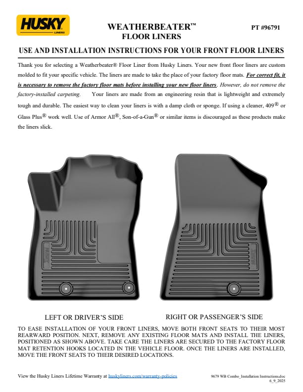 The original all-weather liner is ready, come hell or hot coffee. The Weatherbeater?s construction is a no-slip zone with zero edge curl, and its Stay Put Nibs keep it firmly anchored underfoot. It stands up to chemicals like gas, oil and battery acid, and stays tough and flexible, even under extreme temperatures. Its laser-scanned, FormFit Design? gives your truck, van or SUV an ultra-clean look with easy cleanup to match, while its patented, FormFit Edge? keeps spills contained, carpets unstained. It?s unbeatable Husky protection for life, warrantied the same. Proudly made in the USA.