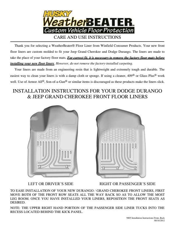 The original all-weather liner is ready, come hell or hot coffee. The Weatherbeater?s construction is a no-slip zone with zero edge curl, and its Stay Put Nibs keep it firmly anchored underfoot. It stands up to chemicals like gas, oil and battery acid, and stays tough and flexible, even under extreme temperatures. Its laser-scanned, FormFit Design? gives your truck, van or SUV an ultra-clean look with easy cleanup to match, while its patented, FormFit Edge? keeps spills contained, carpets unstained. It?s unbeatable Husky protection for life, warrantied the same. Proudly made in the USA.