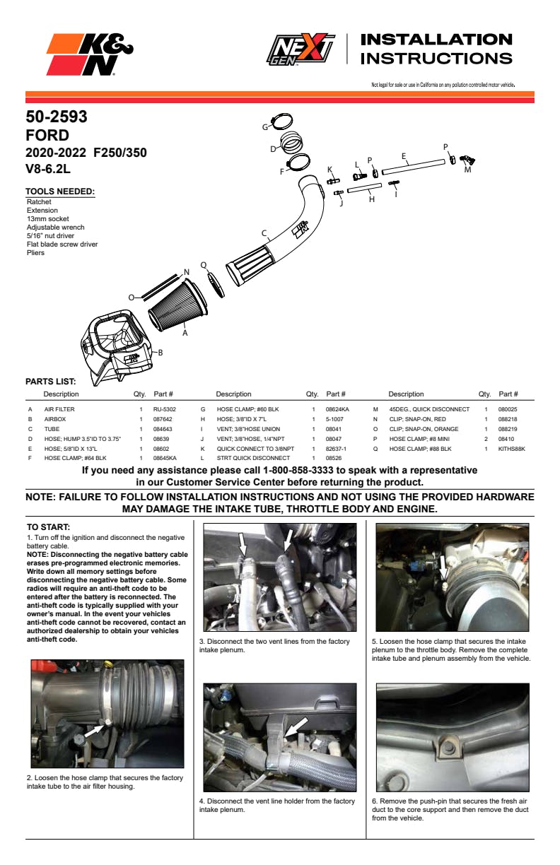 This K&N NextGen cold air intake system is engineered for Ford F250/350 V8 6.2L F/I. A high-density polyethylene (HDPE) rotationally molded tube helps increase the volume of airflow by 34.7% to your engine and provides an increase of 24.92 horsepower and 21.27 torque with no tune required. This intake system is paired with a washable, reusable High-Flow LIFETIME Air Filter featuring oiled cotton filter media. The oversized, conical design allows you to go up to 100,000 miles between filter services under normal highway driving conditions. A custom designed NextGen air box helps protect intake air from the high temperature of your engine bay, and the entire system can typically be installed in less than 60 minutes.