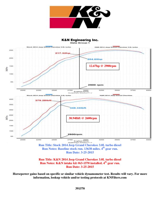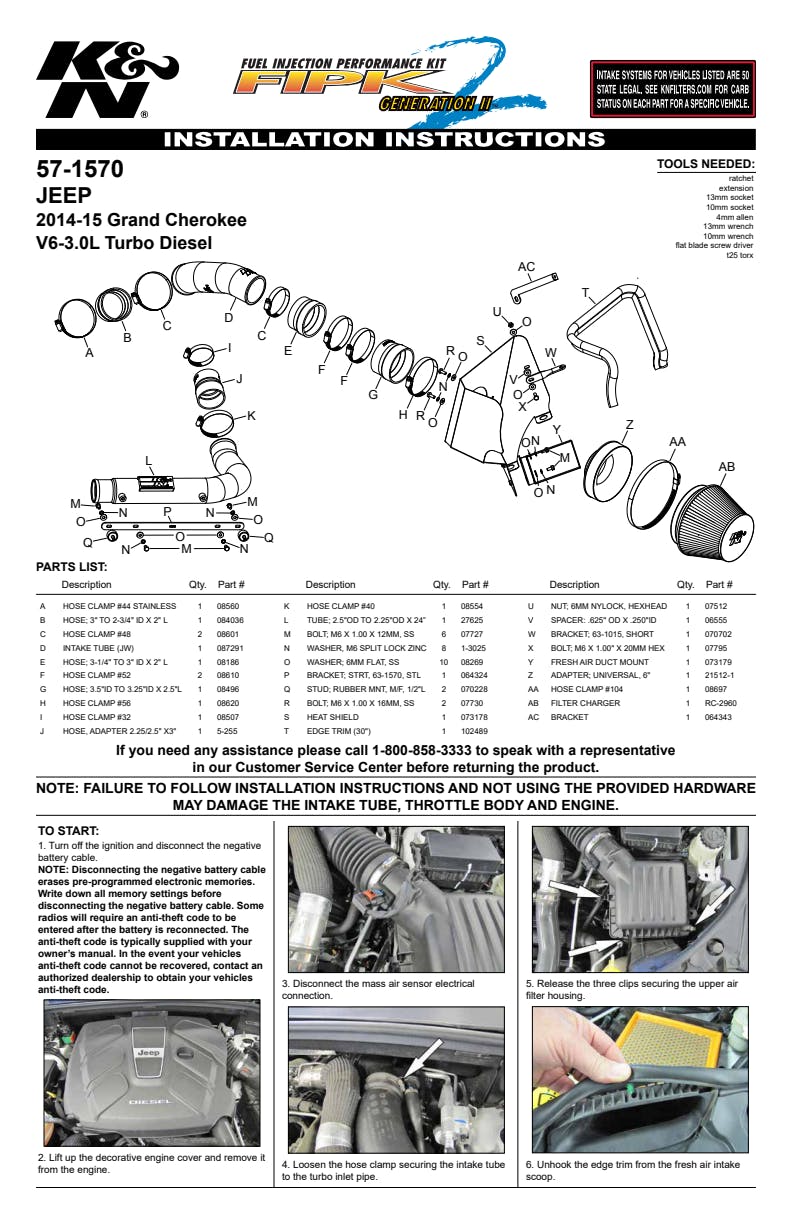 The K&N 57-1570 FIPK air intake system replaces the restrictive factory air filter, air intake housing and intercooler pipe on specific Jeep Grand Cherokee Turbo Diesel models. K&N air intake systems are designed to dramatically reduce air intake restriction as well as smooth and straighten air flow. This allows your engine to inhale a larger amount of air than the factory air filter assembly and turbo intercooler pipe. More air means more usable power and acceleration throughout the engine's RPM range. Air is directed through an aerodynamically engineered intake tube into the engine's turbo inlet for a guaranteed power gain. The 57-1570 air intake system comes with a K&N high-flow air filter and a heat shield that installs into the original air box space. The intake tube accommodates the factory mass air sensor. The oversized cone shaped air filter can be used for up to 100,000 miles before servicing is needed depending on driving conditions. This air intake is relatively easy to install, usually in 90 minutes or less using your vehicle's existing factory mounting points. The tools needed are a flat blade screwdriver, a ratchet set, a 4mm allen, and several wrenches.