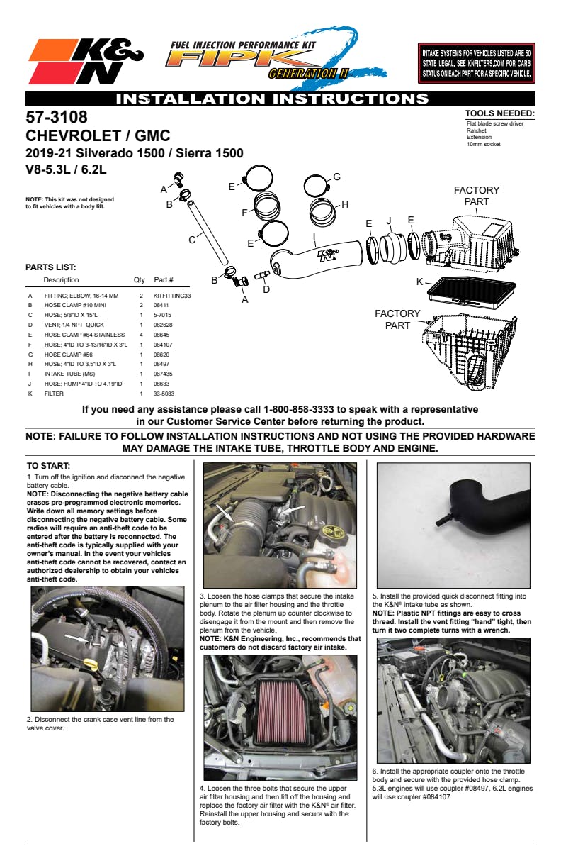 57-series OEM air box intake systems include a washable, reusable High-Flow Air Filter paired with a CAD-designed high airflow intake tube, and is designed to be a simple, cost-effective performance upgrade. The included oiled cotton filter is a direct replacement for your factory filter, drops easily into the factory air box, can go up to 100,000 miles between filter services under normal highway driving conditions, and offers K&N's industry-leading engine protection. Each 57-series OEM air box intake system is designed for specific vehicle applications to ensure a precise fit, and can typically be installed in less than 60 minutes with only standard hand tools. Buy with confidence under the K&N No-Hassle Lifetime Limited Warranty. Legal in all 50 States.