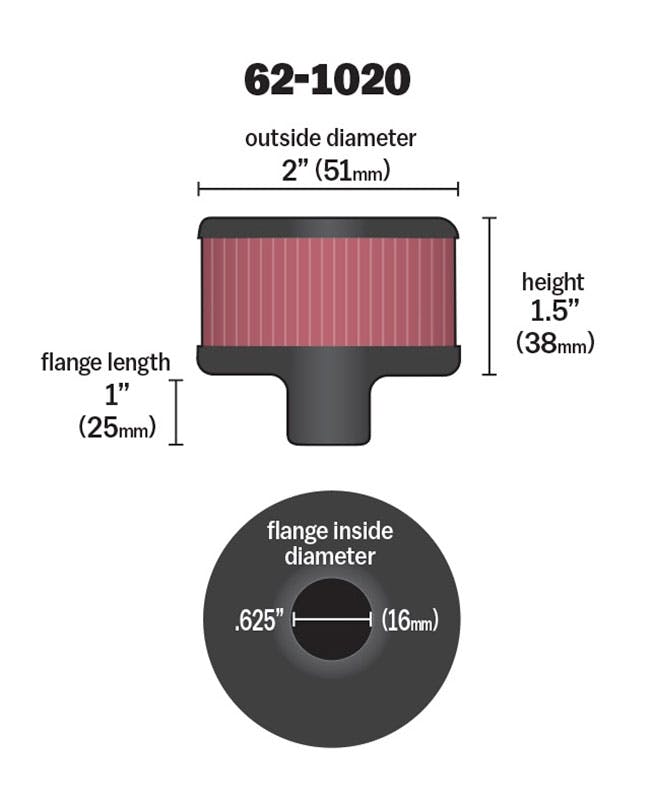 K&N crankcase vent filters are perfect for racing applications, vintage cars or individuals who want to add some aesthetics to their classic carbureted engine. The 62-1020 crankcase vent filter has a K&N embossed rubber top with a chrome-plated steel base. The 5/8 inch diameter zinc tube is designed to push in and clamp directly on to metal or plastic tubing where venting is needed. Constructed with a synthetic filter media it can be cleaned and reused repeatedly.